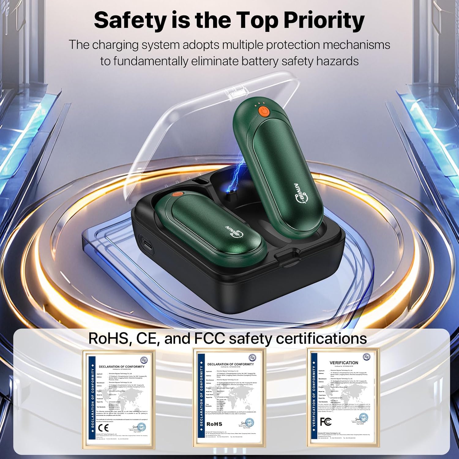 - Reusable & Rechargeable Hand Warmers: Each Rechargeable hand warmer features a powerful 2000mAh battery that ensures long-lasting heat. Comes with a 10000mAh fast charging case, allowing you to recharge on-the-go. The charging case also has its own built-in LED indicator to show the remaining power level