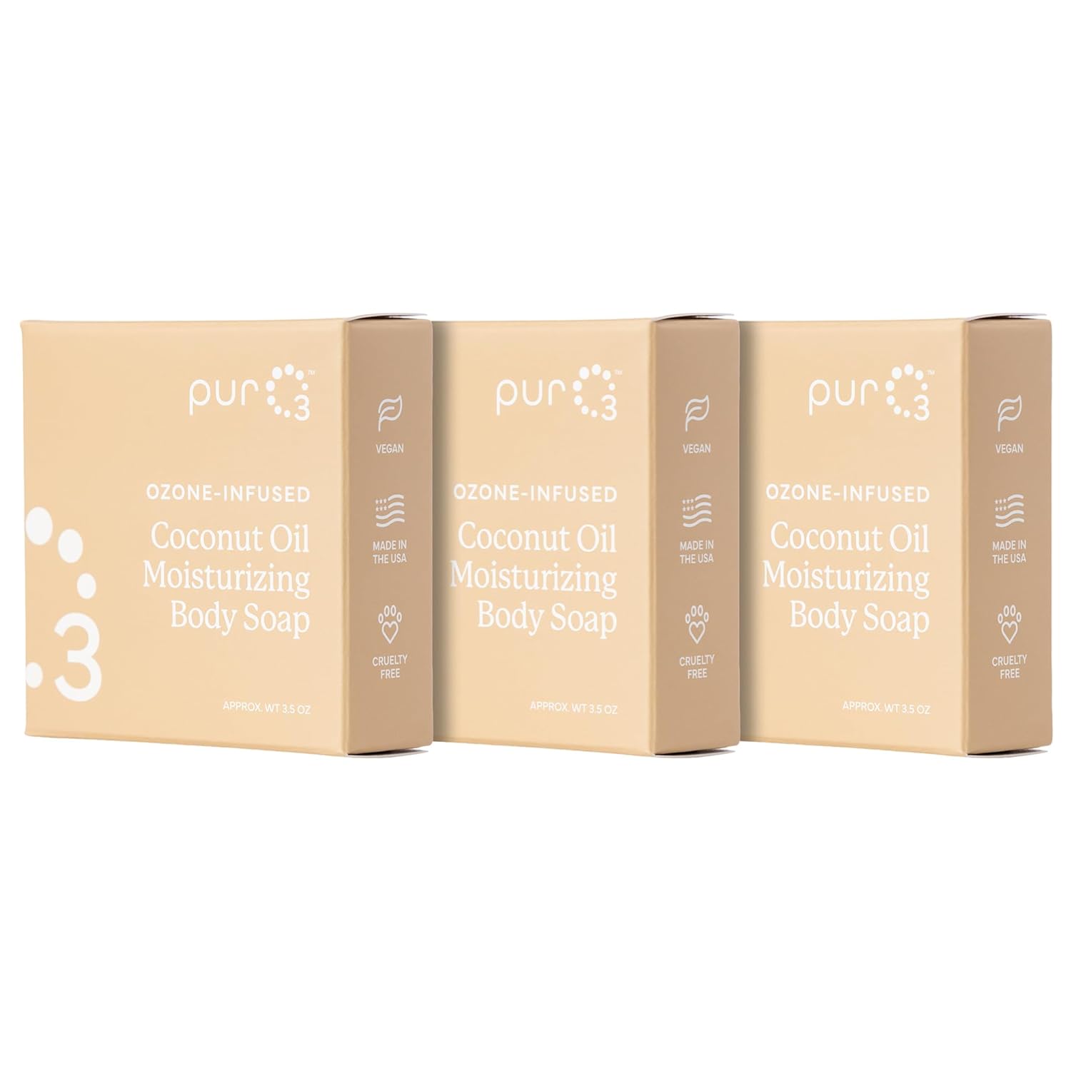 PurO3 Ozonated Coconut Oil Soap 3-Pack – Handcrafted Organic Body Wash – Natural Vegan Bars for Women & Men – Gentle, Biodegradable, Non Toxic Cleanser for Shower & Bath, 3.5 oz Bar Set