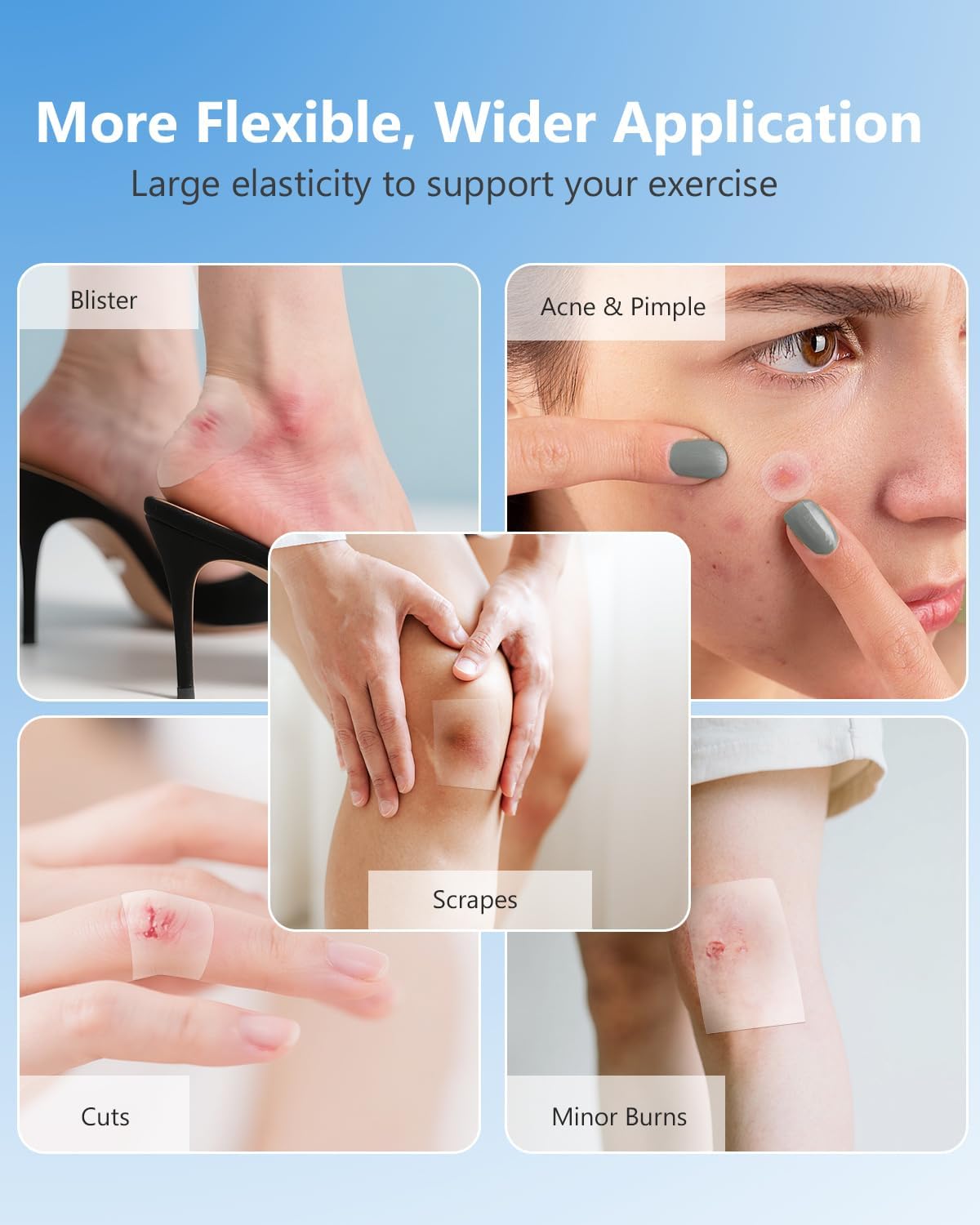 - 🩹 Wide Application: The hydrocolloid bandages provide effective wound care for minor cuts, scrapes, Stage I/II burns, blisters, acne & pimples, pressure ulcers and bedsores. Fit for low to moderate exudating wounds only